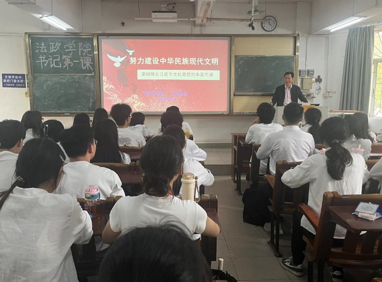 党委书记林忠新在广学楼讲授“思政第一课”,学院第51期入党积极分子80多人参加了学习。