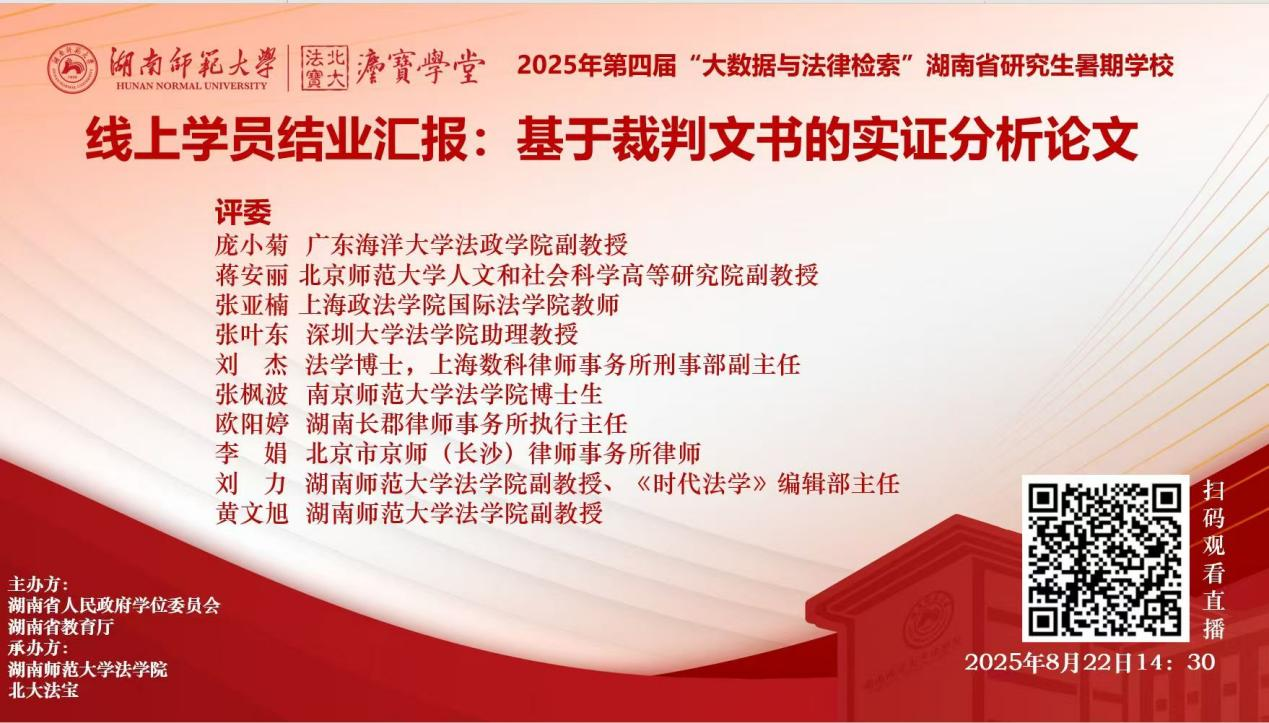 庞小菊副教授受“大数据与法律检索”湖南省研究生暑期学校主办方邀请作为“法宝岳麓”第二届AI法律应用的评委。2025年8月22日,庞小菊教授再次受邀作为线上学员结业汇报的评委。