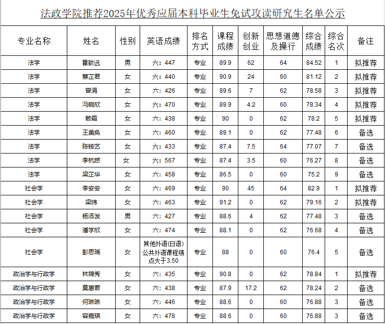 推荐优秀应届本科毕业生免试攻读研究生实施细则》,学院组织了推荐优秀应届本科毕业生免试攻读研究生遴选工作。经本人申报,学院遴选工作小组审核评定后公示。根据综合成绩名次排序,拟向学校推荐瞿致远等8名学生免试攻读研究生。现对相关情况予以公示。