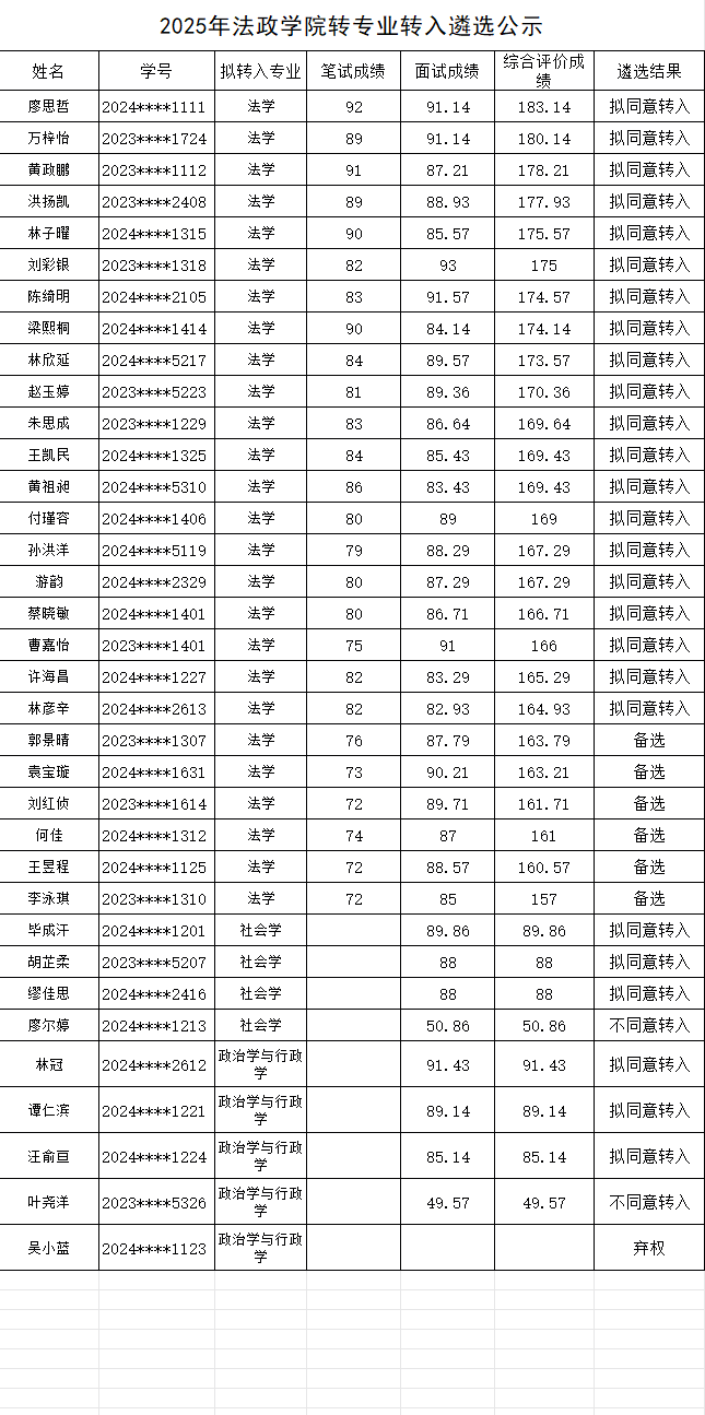 全日制本科生转专业学生遴选办法》,学院组织了转专业转入遴选工作。经学生申报笔试、面试考核,学院转专业工作委员会根据综合成绩进行了排序和遴选,拟同意廖思哲等26名学生转入朱古力av